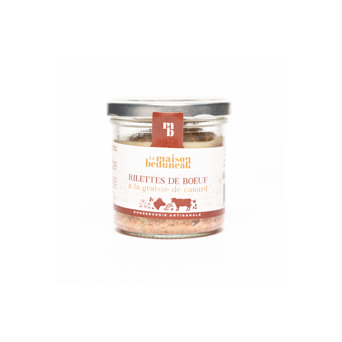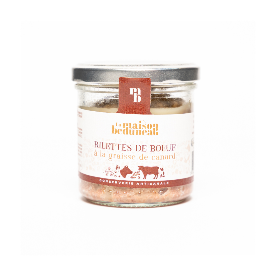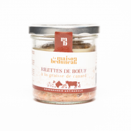 Cette rillettes à base de viande de bœuf exclusivement est cuite dans la graisse de canard pour lui conférer davantage de moelleux. Savourez ces rillettes originales à l'apéritif.