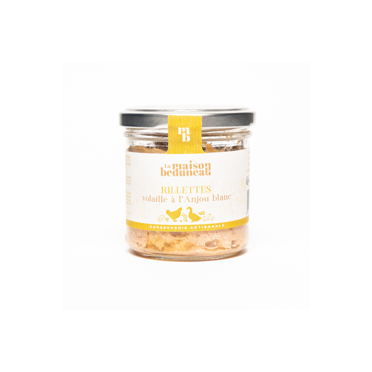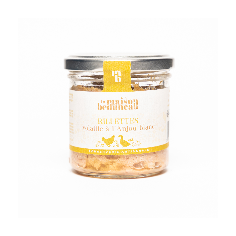 Ces rillettes de volaille sont longuement mijotées dans de l'Anjou blanc, qui remplacent la graisse et en font des rillettes maigres et moelleuses, riches en goût.